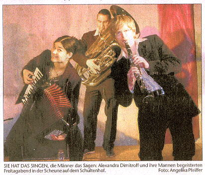 "Ich habe das Singen, meine Männer das Sagen", behauptet Dimitroff. In der Tat war die Leistung von Karel Komnatoff (Trompete), Max Hacker (Klarinette und Soprano), Steve Lukanky (Tuba) und Snorre Schwarz auf einzigartigen Drums mehr als nur der Rede wert. Professionalität strahlte aus allen Poren der Vollblutmusiker, die seit sechs Jahren der Leadsängerin von Berlin aus quer durch Europa folgen und Preise einheimsen. Dabei - und das machte das Programm am Freitag nur zu deutlich - zeigte die Kompassnadel häufig gen Osten.