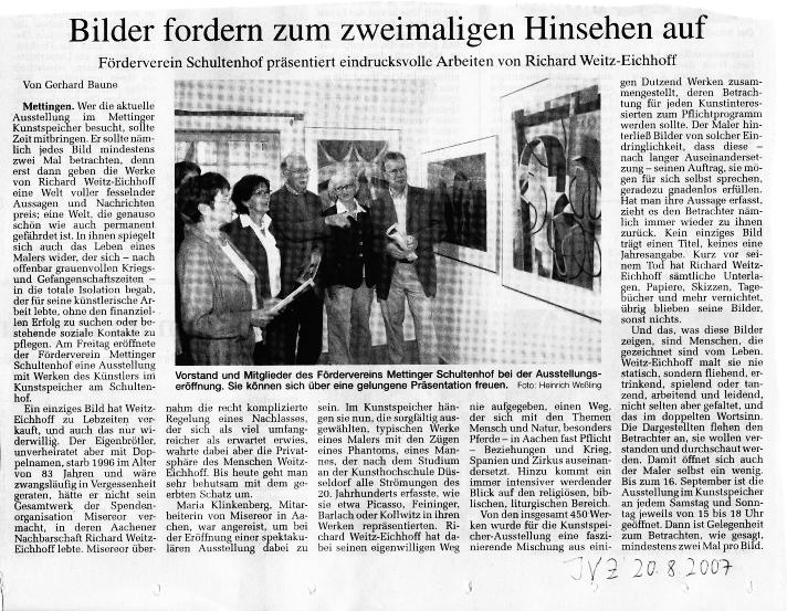 In Zusammenarbeit mit dem Hilfswerk MISEREOR zeigt der Förderverein Schultenhof vom 17.August bis zum 30. September im Kunstspeicher Mettingen eine repräsentative Auswahl von Gemälden des bekannten Aachener Künstlers Richard Weitz-Eichhoff.