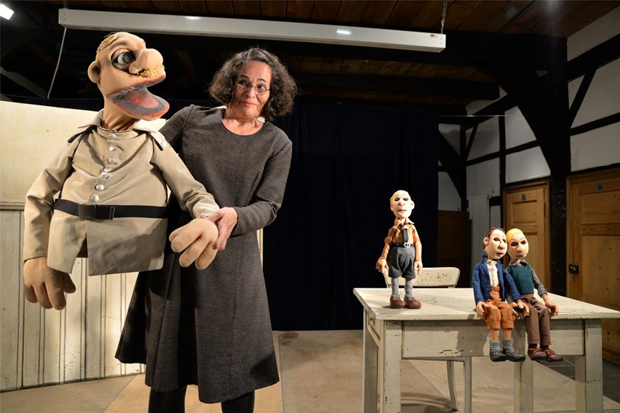 Eine Schauspielerin und verschiedene direkt geführte Figuren agieren auf kleiner