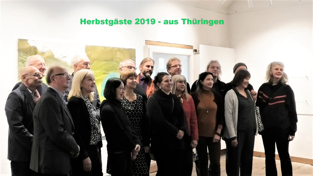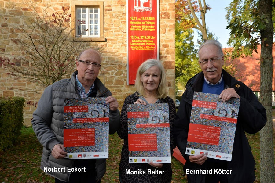 Professor Klaus Nerlich, Vorsitzender des Künstlerverbandes mit rund 350 Mitgliedern, hatte den Weg ins Münsterland ebenfalls nicht gescheut und eröffnete die Ausstellung gemeinsam mit Bernhard Kötter vom Förderverein Schultenhof. „Ich habe noch keine Herbstgäste erlebt, die selbst so engagiert bei der Ausstellungsorganisation waren“, lobte Kötter die Zusammenarbeit mit den Thüringern. Nerlich bedankte sich für die Möglichkeit, zeitgenössische Kunst aus Thüringen im „fernen Westfalen“ präsentieren zu dürfen. „Kunst als verbindendes Element“ fördere den Austausch und sei eine wichtige Grundlage für das Zusammenleben in einem Staat, wie beide betonten.