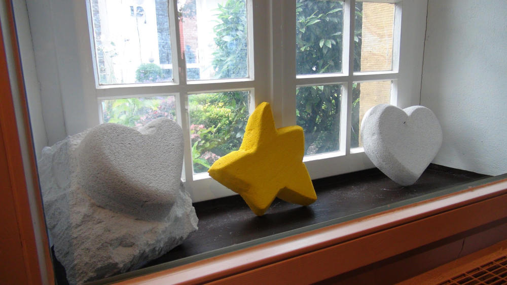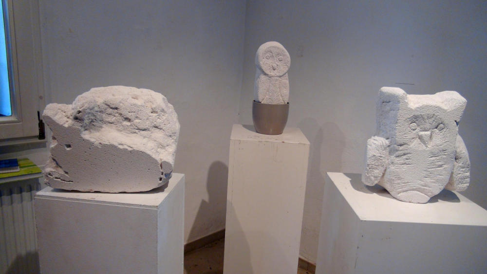 Arbeiten unterstrich. Die Werke standen auf Podesten und zwischen den Scheiben