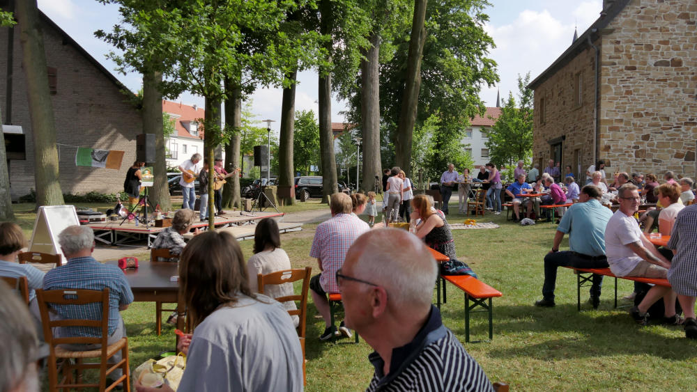 Fürs irische Lokalkolorit sorgte David, der es sich nicht nehmen ließ, auch in Mettingen heikle Themen wie die Eisenbahn anzusprechen. Konnte der aus dem irischen Kilrickle stammende und in Solingen lebende Musiker ja auch nicht wissen. Und Spaß muss sowieso sein, da waren sich die Menschen auf der Wiese und auf der Bühne einig. Auch wenn Letztere wegen der Sonne nicht nur ins Schwitzen kamen, sondern – geblendet durch dieselbe - vermutlich auch Mühe hatten, Erstere wahrzunehmen.